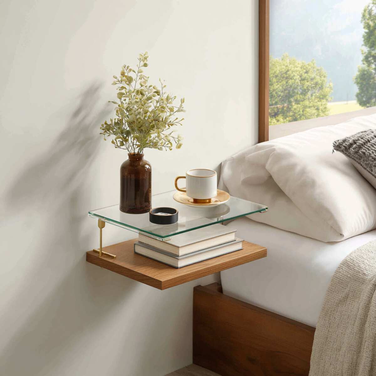 A glass floating shelf looks sleek and light, almost disappearing into the wall. It gives just enough space for a lamp or book without adding bulk.