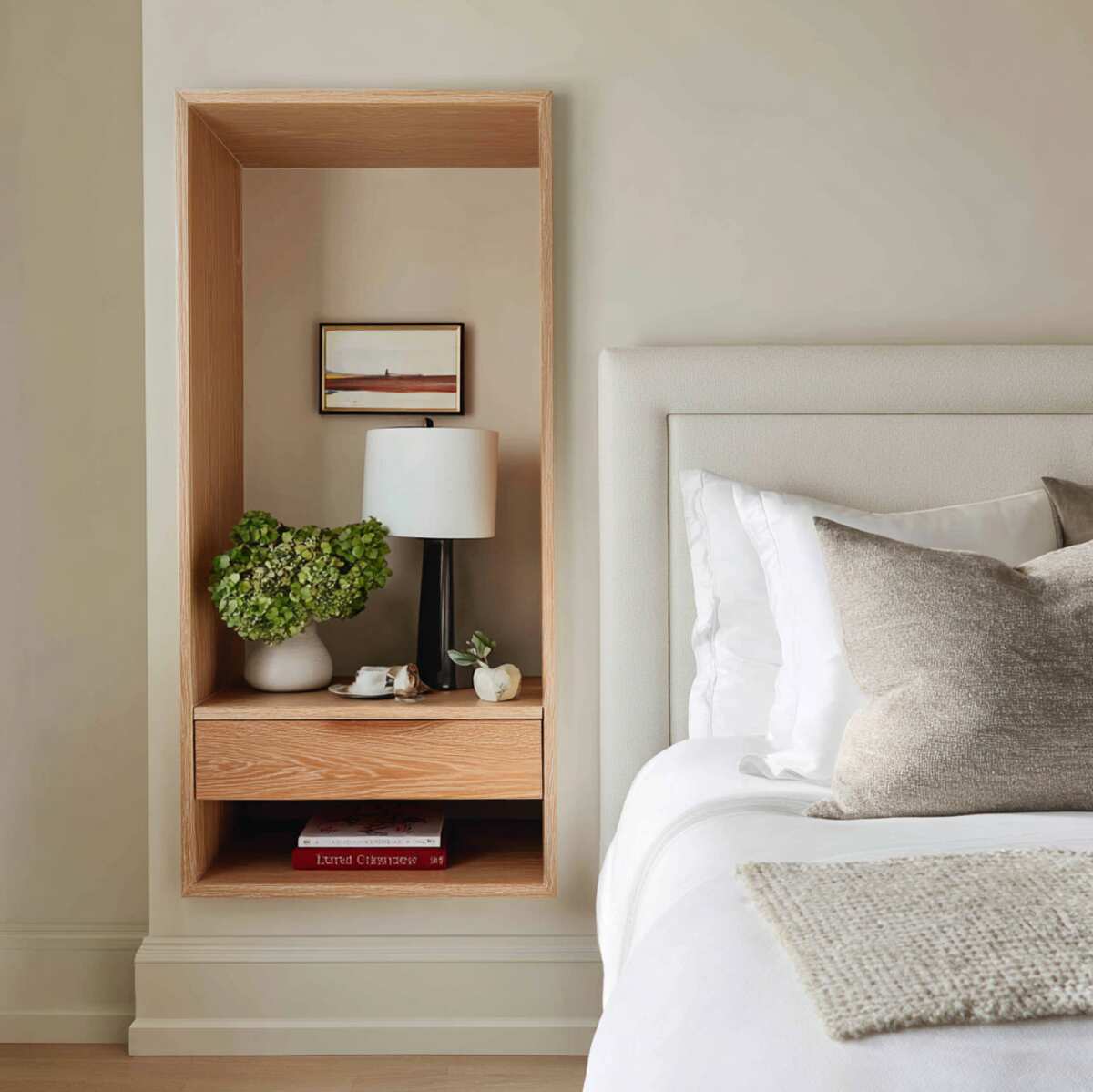 Built-in designs show how wall-mounted nightstand ideas can look seamless and modern.