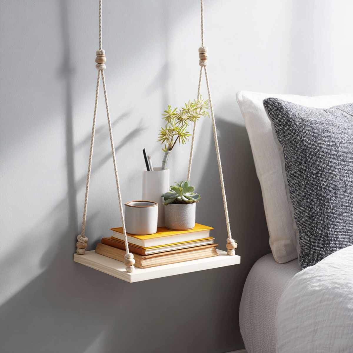 A rope-hung shelf attached to the wall adds a rustic or boho vibe to the bedroom. It’s lightweight yet functional for keeping books or a small lamp.