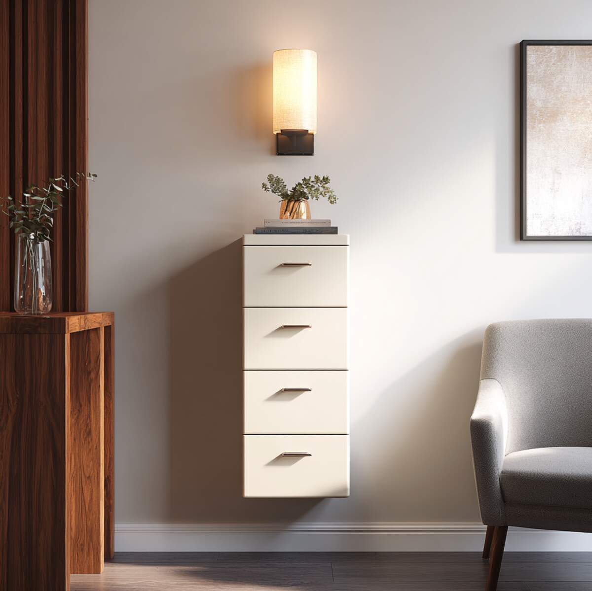 The sleek drawer front keeps the look tidy and uncluttered. As one of the more practical wall-mounted nightstand ideas, it combines storage and style in a small footprint.
