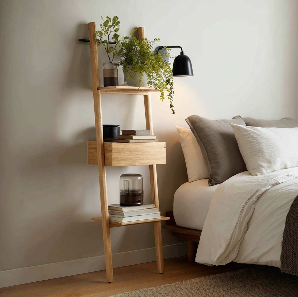 This design uses a ladder-like frame secured to the wall with small shelves along its steps. It gives a playful, vertical twist to traditional nightstands while keeping things organized.