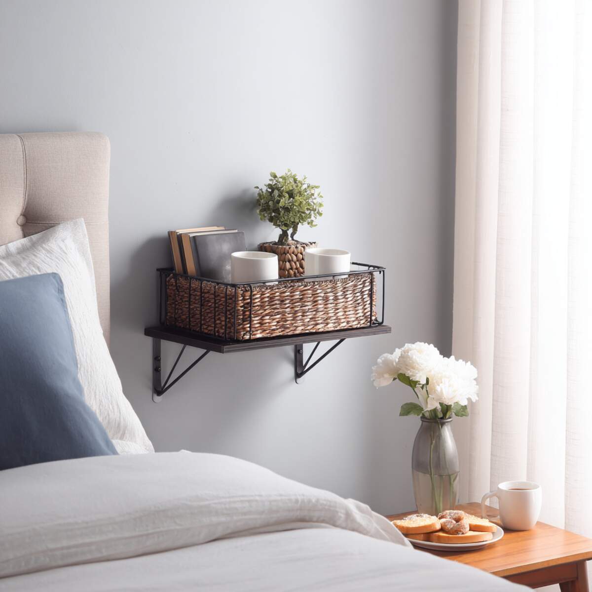 Using a basket-style shelf on the wall makes a nightstand that also doubles as storage for small items.