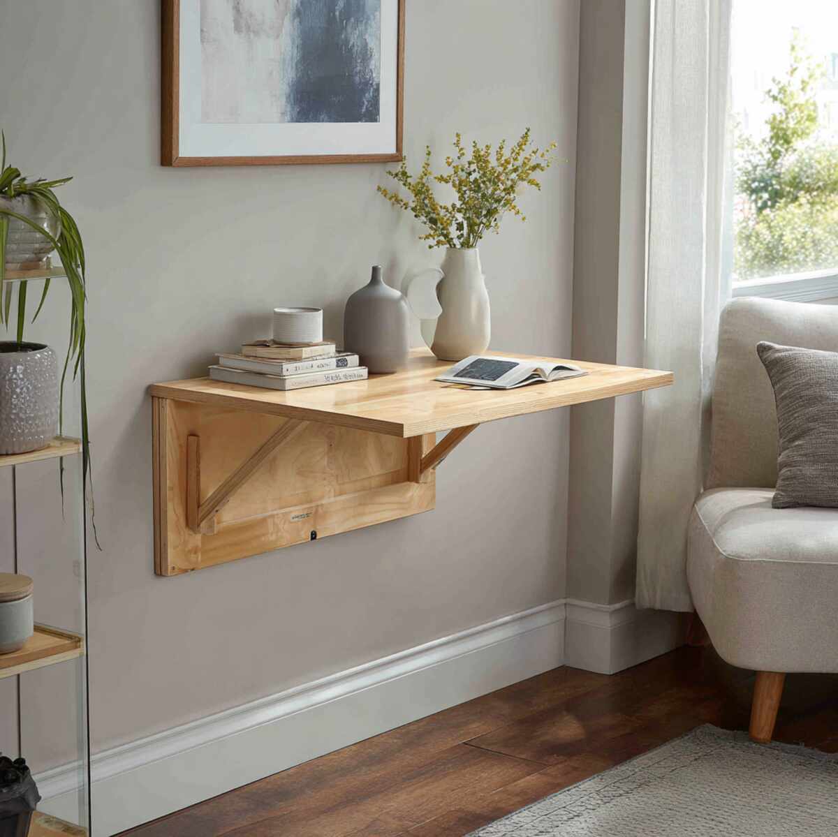 A fold-down wall-mounted table acts as a nightstand when needed and folds flat when not in use. This space-saving feature makes it perfect for very small bedrooms or guest rooms.