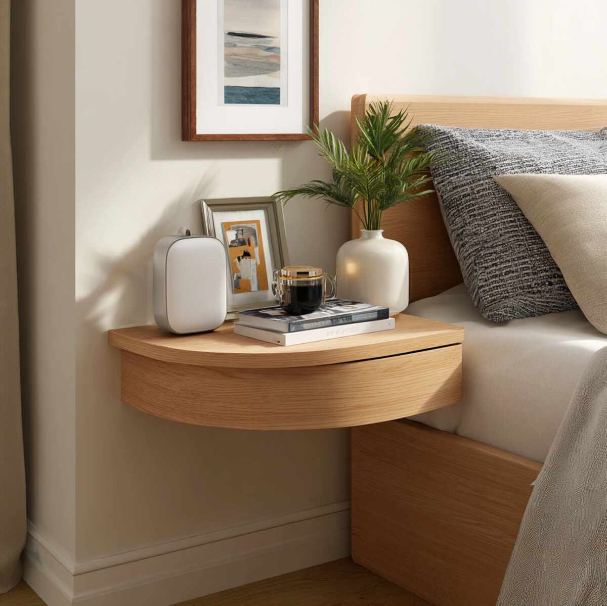 It creates a gentle look while still holding a lamp, book, or alarm clock. Rounded designs make wall-mounted nightstand ideas feel more inviting and safer in narrow rooms.