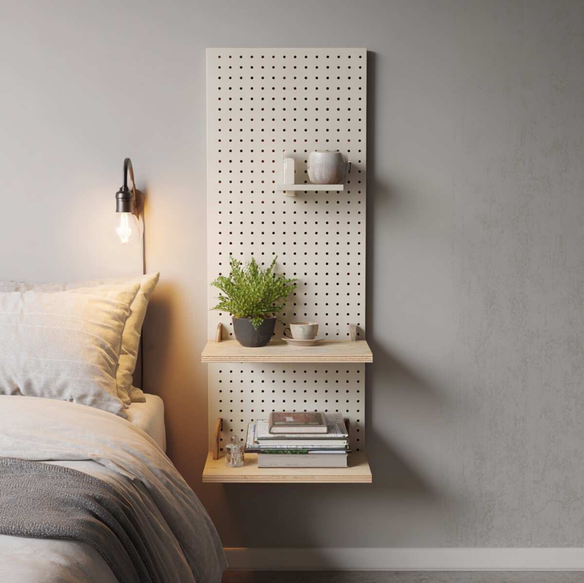 A pegboard mounted beside the bed with small shelf attachments doubles as a customizable nightstand. You can rearrange shelves and hooks for different storage needs.