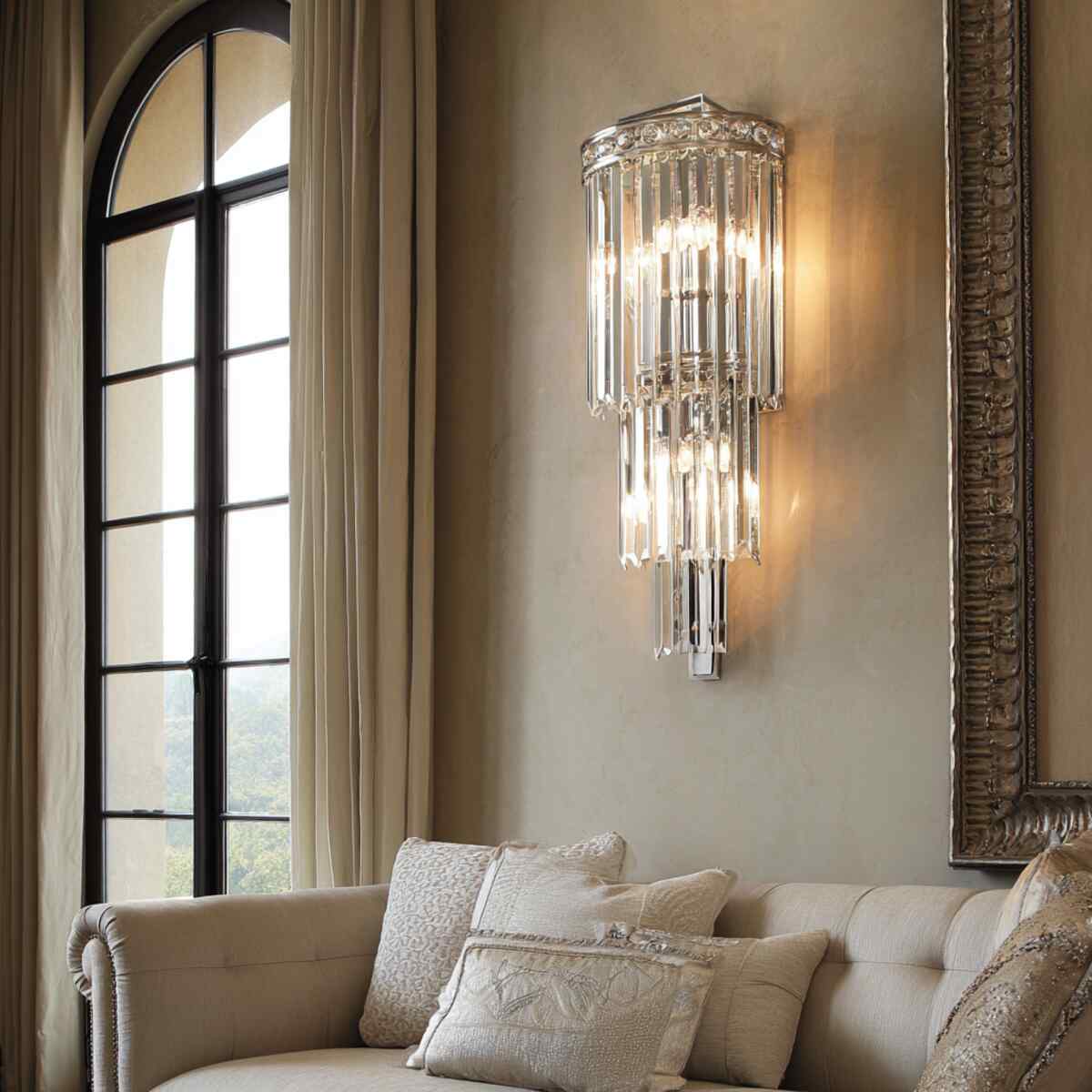 Crystal designs are glamorous Wall Sconce Lighting Ideas for Living Rooms that reflect light beautifully.