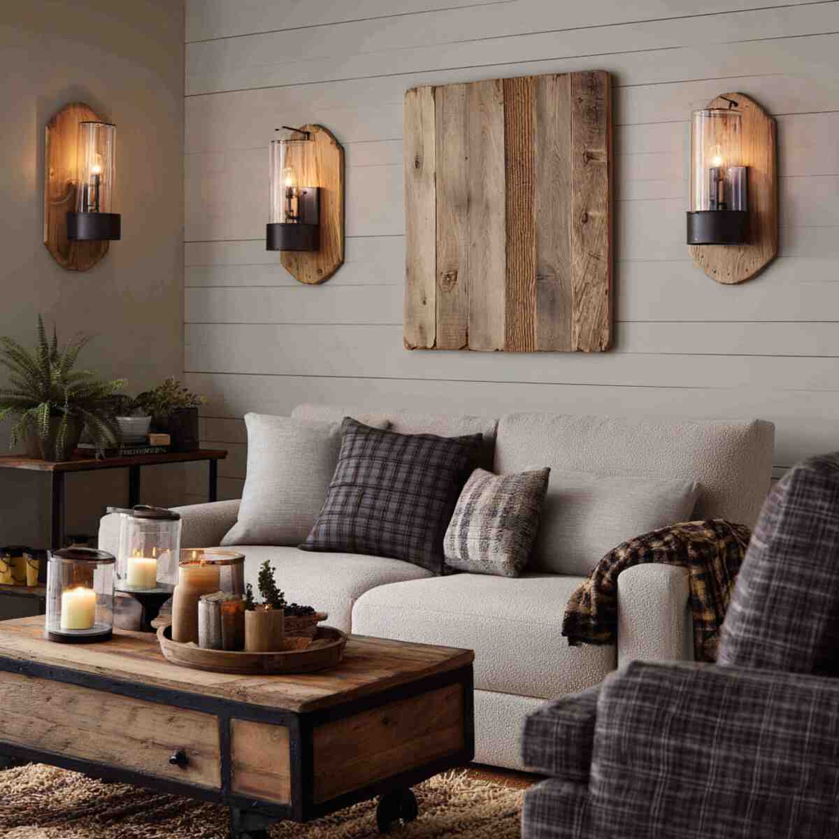 Rustic wood fixtures are natural Wall Sconce Lighting Ideas for Living Rooms that add warmth and texture.
