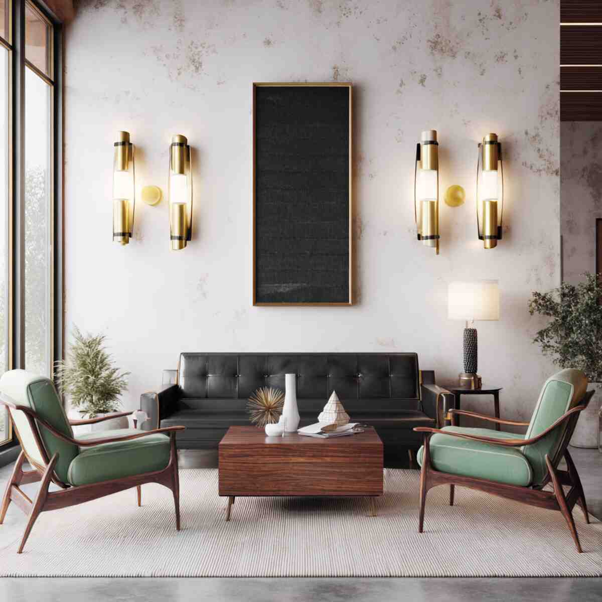 Mid-century designs are stylish Wall Sconce Lighting Ideas for Living Rooms with clean lines and bold shapes.