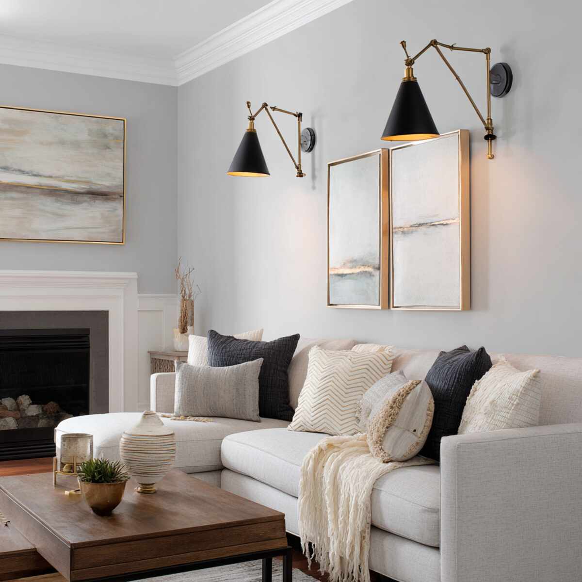 Swing arm designs are functional Wall Sconce Lighting Ideas for Living Rooms that allow adjustable lighting.