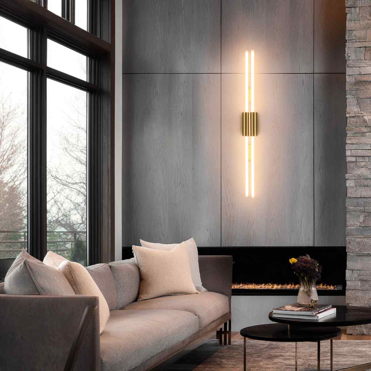 Vertical tube designs are sleek Wall Sconce Lighting Ideas for Living Rooms that emphasize height and structure.