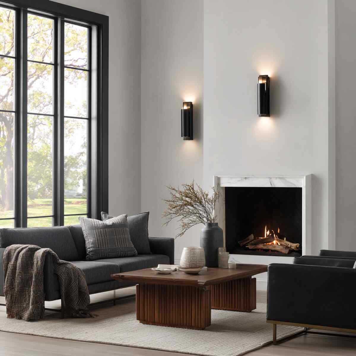 Minimalist black metal designs are sleek Wall Sconce Lighting Ideas for Living Rooms that offer a clean and modern look.