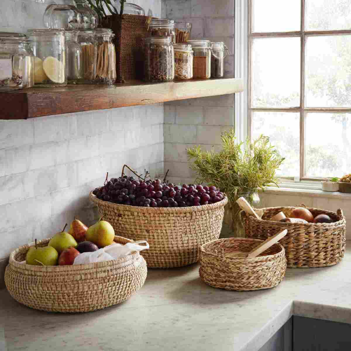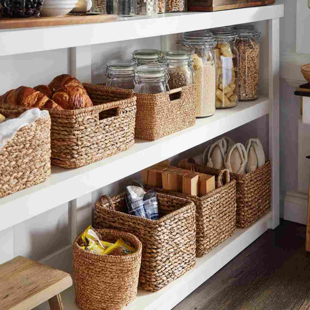 Among woven basket storage ideas for every room, pantry baskets are especially valuable for keeping kitchens functional.