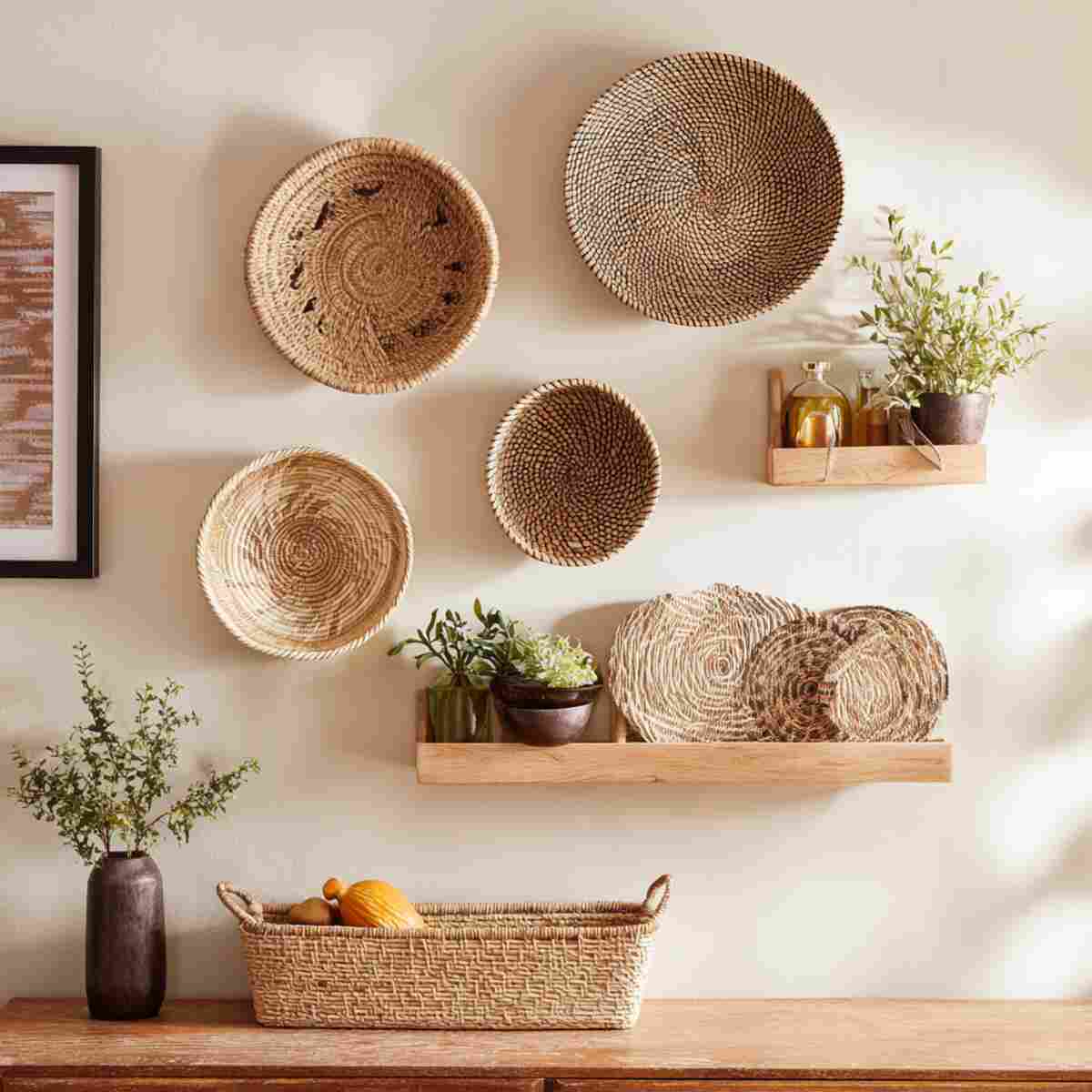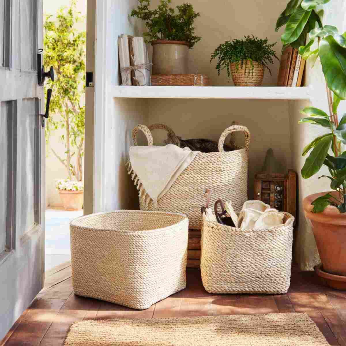 Wall-mounted woven baskets save floor space while offering stylish storage for mail, keys, or even plants.