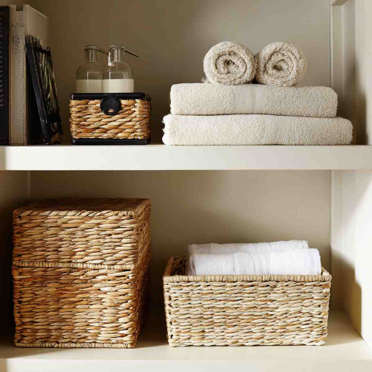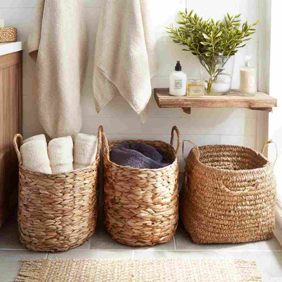 Rolled towels in baskets look spa-like and save shelf space while keeping things neat. As woven basket storage ideas for every room, they add warmth and texture to an otherwise plain setting.