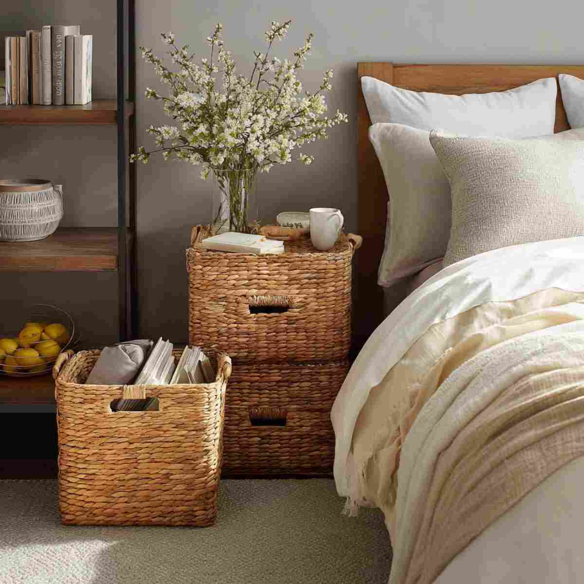 Instead of nightstand drawers that get overcrowded, a woven basket by the bed can hold books, slippers, or nighttime essentials. It keeps the area tidy while adding a cozy, natural look.