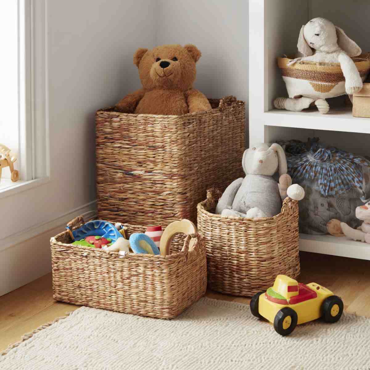 Toys can scatter across a room faster than you can pick them up. Large woven baskets give kids an easy way to toss toys inside, keeping play areas neat and stress-free.